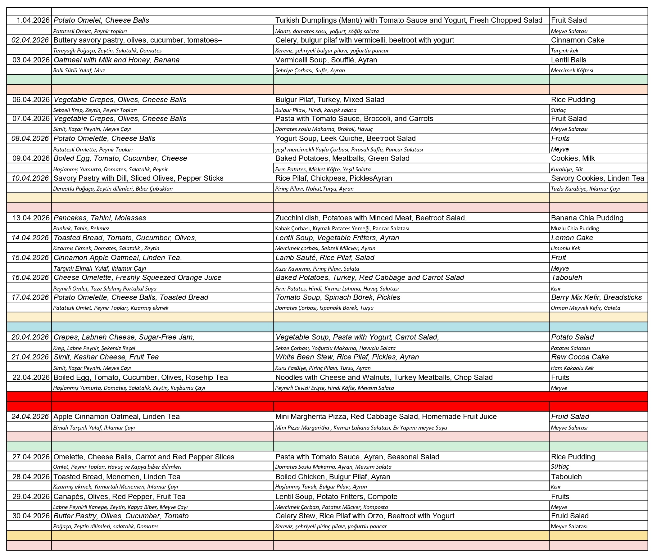 We offer morning snack, lunch and afternoon snack to our children. Since children have meals every 3 hours at school, we will not need any food sent from home unless your child has allergies. For hygienic and health reasons, we do not accept any food including candies or chocolates to our school. All of our dishes in our lists are home cooked with fresh and seasonal ingredients.